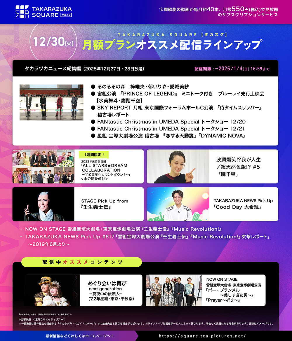 動画配信サブスクサービス“TAKARAZUKA SQUARE【タカスク】”ラインアップ更新! 2025.12.30 Tweet サービスページはこちら https://square.tca-pictures.net/ お問い合わせはこちら https://square.tca-pictures.net/inquiry