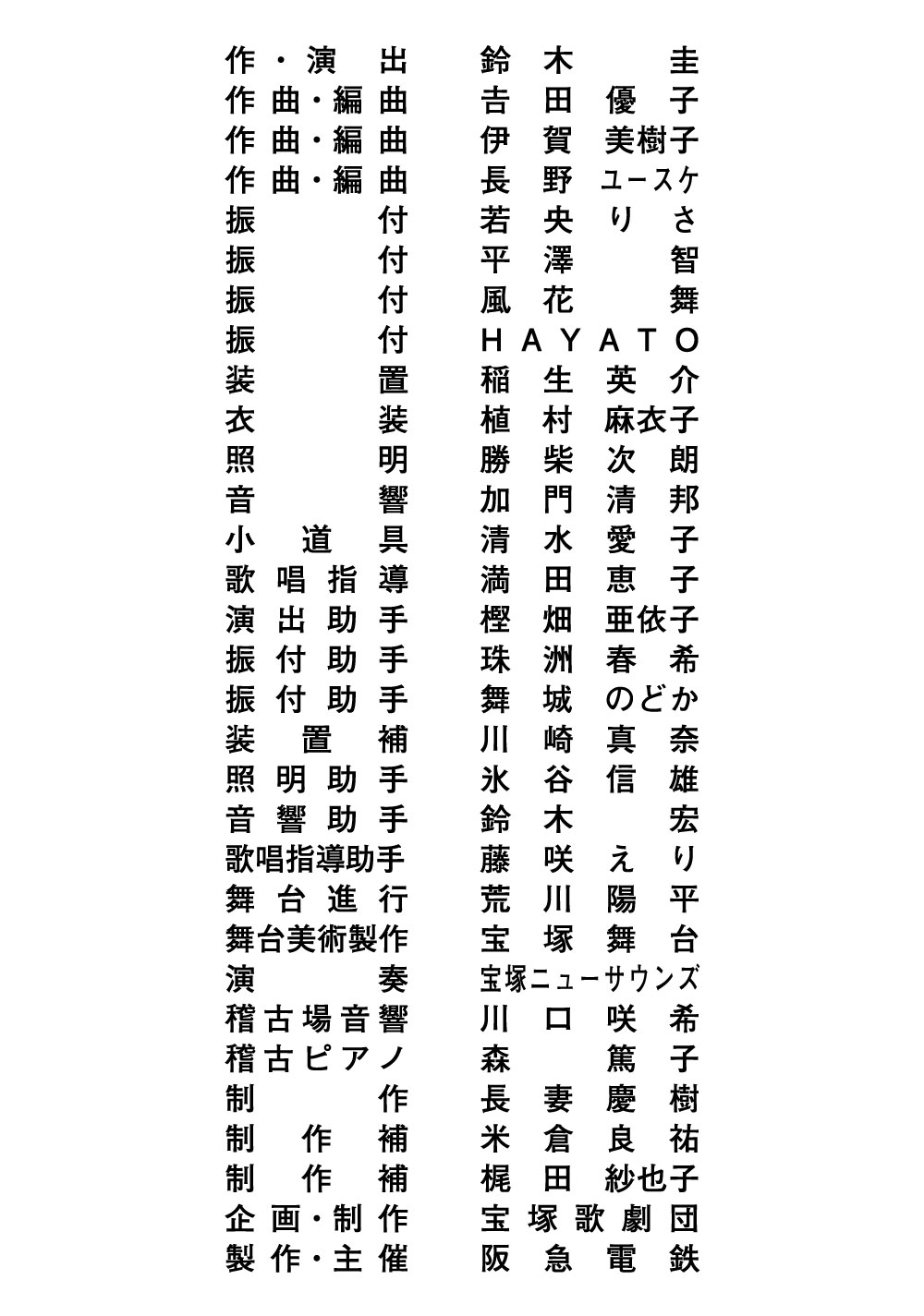 キャストほか Tweet 出演者一覧スタッフ 出演者一覧 宙組 嵐之 真 真白 悠希 楓姫 るる 泉堂 成 山吹 ひばり 聖 叶亜 鳳城 のあん 波輝 瑛斗 花咲 美玖 風翔 夕 結沙 かのん 澄乃 紬 華乃 みゆ 愛城 美紗 梨恋 あやめ 花恋 こまち 志凪 咲杜 海玖里 粋 楓莉 かの 輝星 成 響 望歌 一斗 勇輝 悠久 颯 華愛 りりい 志槻 りゅう ※ゆり遥は、全日程休演いたします。 スタッフ