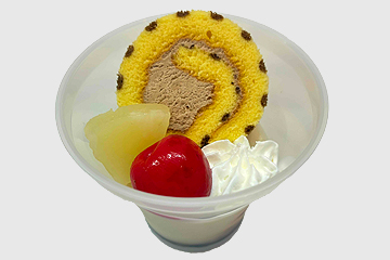 バナナプリンにチョコレートソースを入れ、チョコバナナのロールケーキ、ホイップクリーム、パイナップル、チェリーをのせました。南国をモチーフしたデザートです。