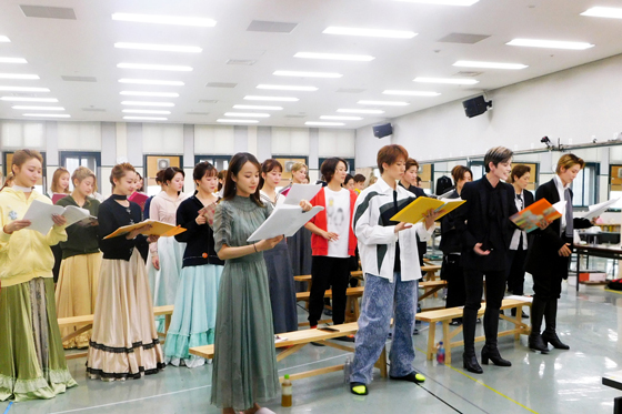 雪組生が、この日までに稽古を重ねてきた情熱的で伸びやかな歌唱を披露すると、同氏からは、壮大なナンバーからモダンな楽曲まで、一つひとつに込められた心情やその表現方法など、作曲家の視点からの熱意のこもったアドバイスをいただき、今作への期待と手ごたえを確かめあう機会となりました。