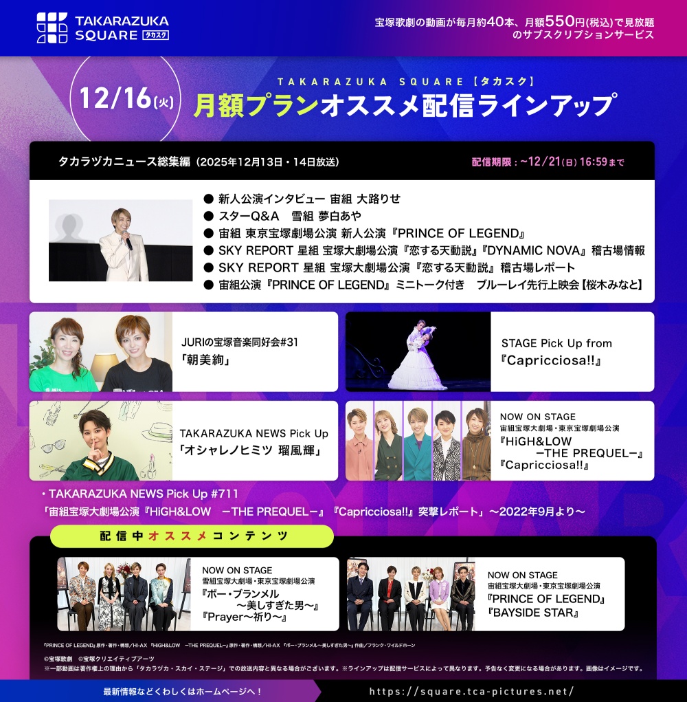 動画配信サブスクサービス“TAKARAZUKA SQUARE【タカスク】”ラインアップ更新! 2025.12.16 Tweet サービスページはこちら https://square.tca-pictures.net/ お問い合わせはこちら https://square.tca-pictures.net/inquiry