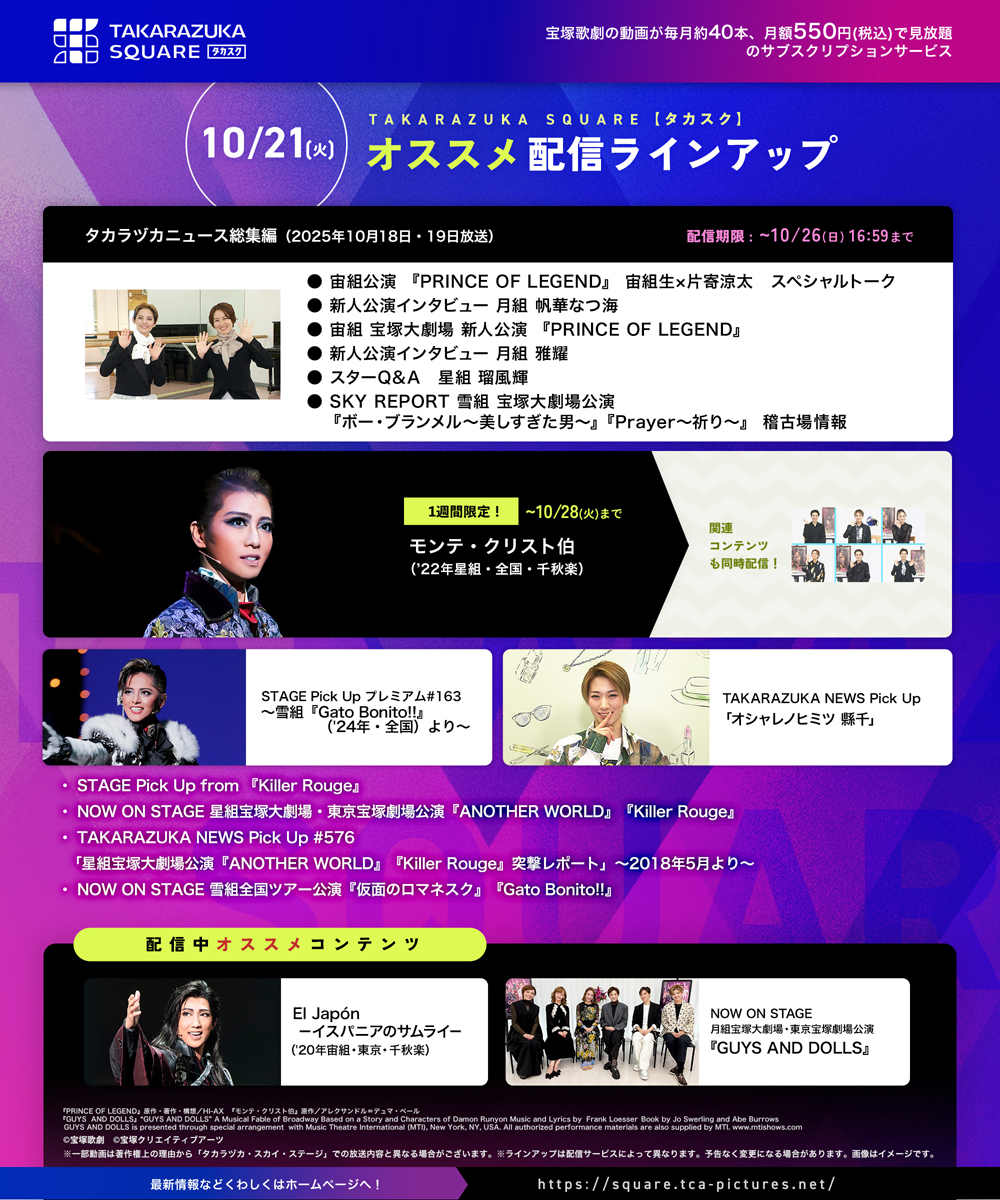 動画配信サブスクサービス“TAKARAZUKA SQUARE【タカスク】”ラインアップ更新! 2025.10.21 Tweet サービスページはこちら https://square.tca-pictures.net/ お問い合わせはこちら https://square.tca-pictures.net/inquiry