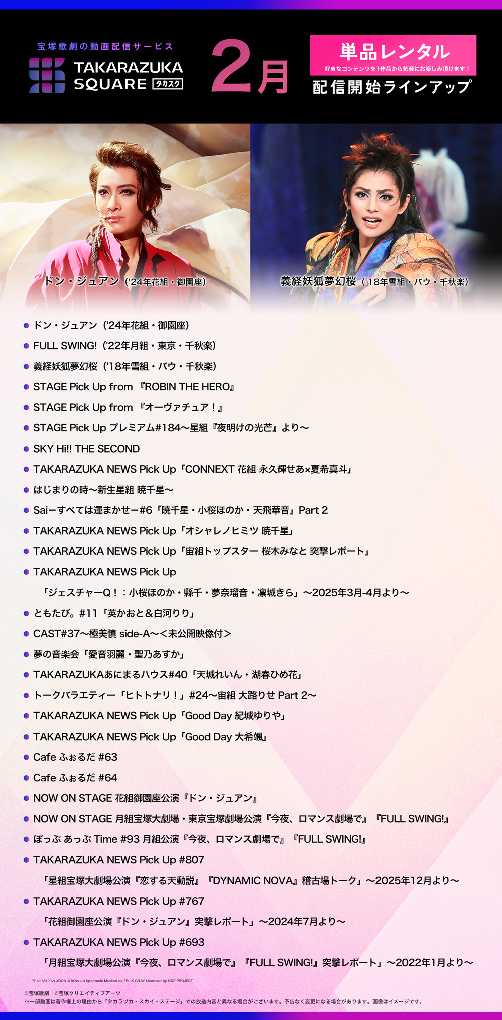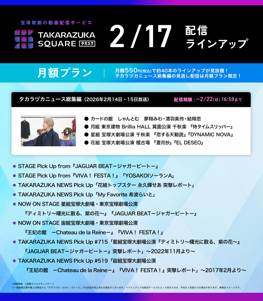 動画配信サービス“TAKARAZUKA SQUARE【タカスク】”ラインアップ更新! 2026.02.17 Tweet 最新ラインアップ サービスページはこちら https://square.tca-pictures.net/ お問い合わせはこちら https://square.tca-pictures.net/inquiry