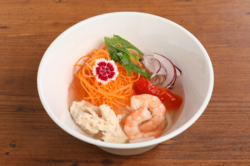 あっさりとしたチキンスープのフォーに鶏肉・海老・大葉などをトッピング。
